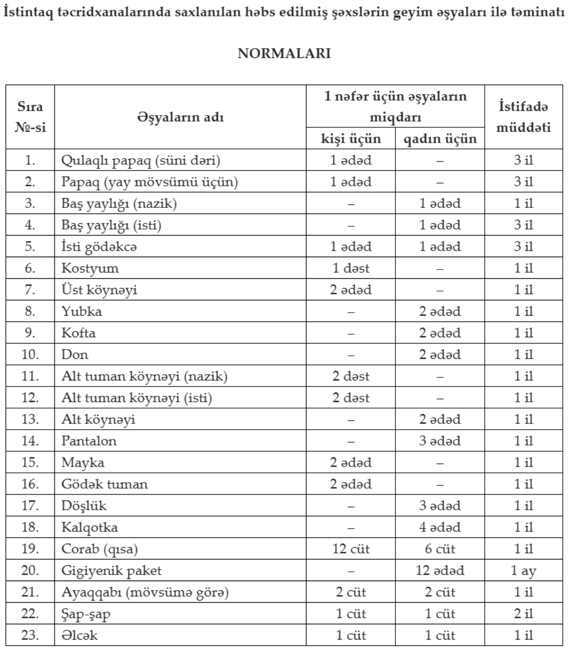 Nazirlər Kabinetinin “Tutulmuş və ya həbs edilmiş şəxslərin yemək və maddi-məişət normalarının təsdiq edilməsi haqqında” Qərarı; https://e-qanun.az/framework/29226